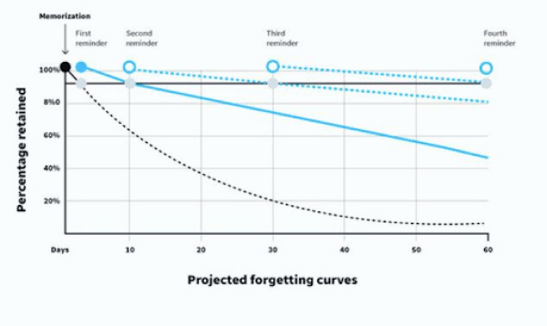 يجب أن يكون التعلم متباعدًا لإعطاء المعلومات وقتًا كافيًا للتخزين في الذاكرة. من الطبيعي أن ينسى المتعلمون ما يصل إلى 50% مما تعلموه خلال ساعة واحدة دون مراجعة، لذا فإن التكرار المتباعد مفيد بشكل خاص عندما تريد الاحتفاظ بالمعلومات.